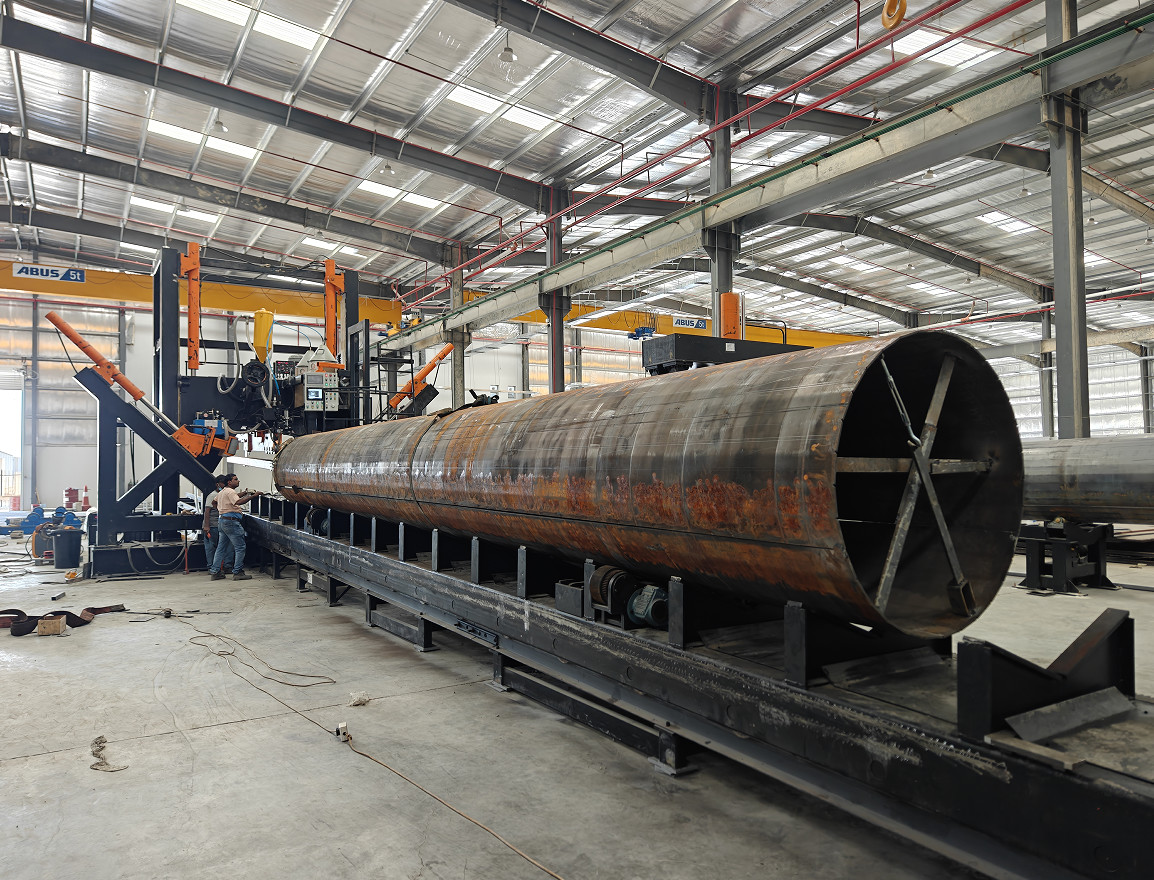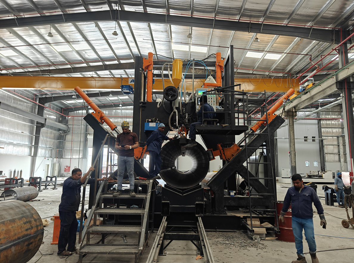 Для двух швов, когда завершается сварка первого шва, нижний ролик поднимается и поворачивает столб в другое положение шва, чтобы начать сварку второго шва.